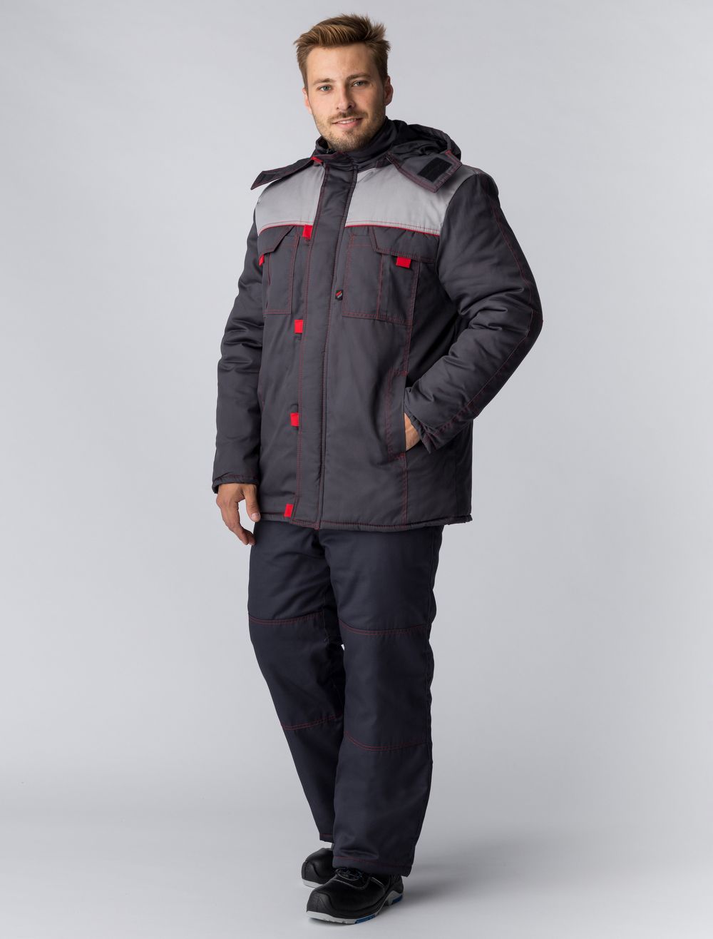 В комплект входят брюки на бретельках и удлинённая куртка с утяжками. Костюм подходит для использования на стройке, в автомастерских и на производствах в зимнее время. На груди, спине и в нижней части брюк имеются вставки из светоотражающего материала, повышающие заметность работника ночью. Воротник с отворотом, отделан мехом. При необходимости его можно поднимать для защиты шеи от ветра. Имеется капюшон с утяжками и застёжкой. На куртке предусмотрены нагрудный накладной карман под рацию и два больших кармана в нижней части. В области талии имеется утяжка. Куртка застёгивается на пуговицы.